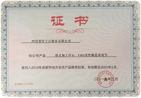 近日,四川普什寧江機(jī)床有限公司臥式加工中心、FMS柔性制造系統(tǒng)等七種產(chǎn)品榮列《2019年成都市地方名優(yōu)產(chǎn)品推薦目錄》。