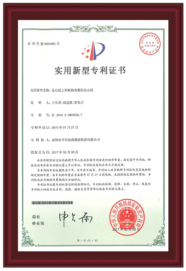 中華人民共和國國家知識產權局于2017年2月8日向深圳市今日標準精密機器有限公司頒發了《實用新型專利證書》。