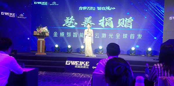 慈善捐贈儀式尚未舉行,但現場已成歡樂的海洋。在激光產品的樣品區,很多孩童瞪大了眼睛,被眼前的摩天輪、機器人、留聲機、火車、風車、飛機、面具、花朵等所吸引。這些都是微型版本的,材質是木板、紙板、塑料、橡膠、金屬、皮具、布料等,全是使用金威刻3D智能云激光雕刻機制作出來的。