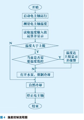 電主軸定子處的溫度采用鎳鉻,鎳硅熱電偶進(jìn)行測(cè)量,采用PLC對(duì)溫度進(jìn)行控制,溫度在25℃~28℃,時(shí),采用自然冷卻。若測(cè)量溫度大于上限值28℃,通過(guò)調(diào)節(jié)冷卻裝置水泵的壓力,加快冷卻水的流速,進(jìn)而加強(qiáng)電主軸的對(duì)流換熱作用,達(dá)到降低電主軸溫度的目的。控制流程圖如下圖4所示。