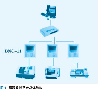 遠程監控平臺是由一臺PC機、一個集線器、若干個DNC-11數控系統連接機床而成,形成一個星形的拓撲結構。遠程監控平臺的總體結構如圖1所示。