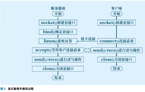 根據采用的通訊協議,并考慮到對通信可靠性和正確性的要求較高,本監控平臺選用流式套接字來實現網絡通訊。基于Client /Server模式的流式套接字通訊過程如圖3 所示。