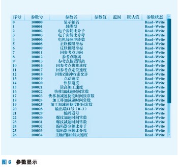 每臺數控設備的參數管理界面主要顯示的是參數號、參數名和參數值等,其中參數號與參數名不支持用戶修改,參數值為用戶的編輯項,因而參數的顯示可使用兩個靜態文本控件和一個編輯框控件。但由于上述顯示方式中存在問題及不足,在人機界面的開發中,使用繼承自CListCtrl類的CReportCtrl類,在列表控件已有的功能基礎上封裝數據項的編輯功能,并提供一些操作的函數接口。使用列表控件顯示參數的界面如圖6所示。