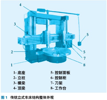 現在我國使用的普通雙柱立式車床沿用了前蘇聯的技術,設計時比較保守,整體質量較大,大多數企業生產的雙柱立式車床總體結構變化不大,如圖1所示,其結構主要由底座、立柱、橫梁、頂梁、控制面板、控制柜、刀架和工作臺等組成。傳統雙柱立式車床的結構復雜笨重,立柱、底座和橫梁等大型零件需要鑄造來完成毛坯生產,從而使得加工和運輸都不方便。