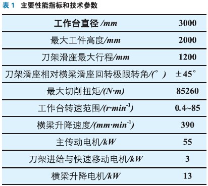 雙刀架通過刀架滑座安裝在橫梁上,安裝刀具實現切削加工;橫梁由圓柱橫梁和T 型橫梁組合而成,通過兩端的立柱滑座安裝在圓立柱上,分別主要承受由于切削加工作用在刀架上的切削力和扭矩;立柱滑座的前端連接有行走架,便于相關人員在上面行走進行零件的安裝找正或機床維修;機床左右兩側龍門式安裝圓立柱在底座和頂梁之間,作為橫梁上下移動的軌道,為了增加圓立柱的強度和穩定性,由一空心方立柱輔助支撐;橫梁的上下移動由同步傳動機構來完成;為了減少同步傳動的傳動功率,橫梁設有平衡重,平衡重塊安放在方立柱空腔內;工作臺在底座上、刀架下,實現工件裝夾和工件的旋轉。以上各零部件間通過高強度螺栓進行聯接,該機構形式有利于運輸、加工和裝配工藝。新型雙柱立式車床的主要性能指標和技術參數如表1所示。