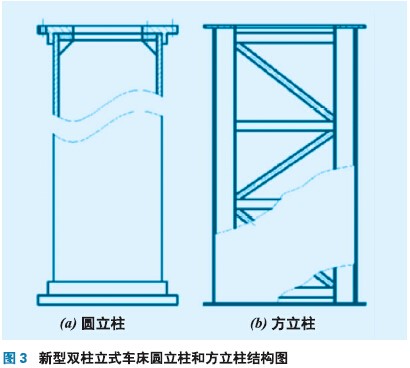 采用圓柱立柱和方形立柱組合的方式作為該機床的立柱支撐方式,與傳統雙柱立式車床相比,圓柱導向接觸面積大,單位面積承載力小,剛性好,導向精度高,不需要制作大型的鑄件,選用型材,采用焊接、切削加工、熱處理和鍍鉻工藝就可以方便完成加工。圓立柱和方立柱結構如圖3所示。