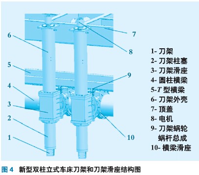 在傳統雙柱立式車床的基礎上創新設計了橫梁,新型雙柱立式車床的橫梁有圓柱橫梁和T型橫梁組合而成,如圖5所示,分別聯接安裝在立柱滑座上,可以隨立柱滑座在圓立柱上做直線移動。