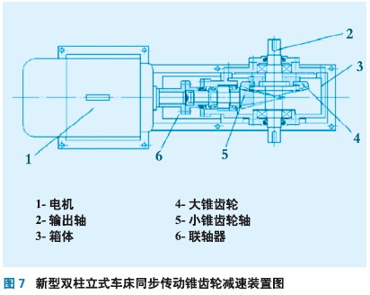 雙柱立式車床龍門跨度大,橫梁組件和刀架組件重量較重,需要在兩端提升橫梁,因此需要同步傳動機構來實現橫梁的升降,其整體結構外觀如圖5所示,其主要包括同步傳動錐齒輪減速電機、同步傳動軸總成、Z軸傳動總成和橫梁升降螺母座等部分組成。同步傳動錐齒輪減速電機裝置如圖7所示,電動機輸出的動力由電機輸出軸經聯軸器,傳給小錐齒輪軸,通過與其嚙合的大錐齒輪傳給同步傳動的雙輸出軸,再通過同步傳動軸總成傳給頂梁兩端的Z軸傳動總成,Z軸傳動總成是一對蝸輪蝸桿傳動,實現輸出方向改變和自鎖作用,最后通過Z軸傳動總成的輸出絲杠軸帶動安裝在T型橫梁上的絲杠螺母座移動,從而實現橫梁的升降運動。另外,為了減小同步傳動的傳動功率,通過平衡重滑輪組有一安放在方立柱空腔內的平衡重塊用鋼絲繩與橫梁相連。