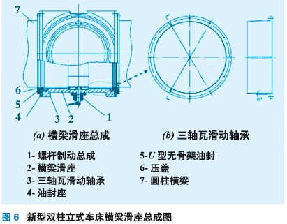 采用圓柱導軌和T型導軌組合方式導向,導向精度高,剛性好,橫梁滑座兩端設有密封圈和防塵圈,一次性加油可以長時間使用,確保自動潤滑、防塵并減震,橫梁滑座兩端安裝有三軸瓦滑動軸承,可通過其錐面調整軸承和圓柱橫梁之間的配合間隙,不需要周期性研磨導軌,精度保持期提高4倍以上,其結構如圖6所示。