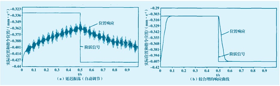 圖4(a)為系統自動調節時的響應,系統有較大的跟隨誤差,曲線同時伴隨著振蕩,因此自動調節很難達到控制要求,必須進行手動調節。圖4(b)的曲線是對PMAC的PID參數經過手動調節后得到的,比較理想,能夠滿足控制要求。