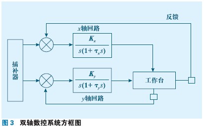 一般的數控機床工作臺為兩軸運動,且兩軸采用各軸分開驅動的方式,其方框圖如圖3所示,下面分析中簡化非線性環節,將機械部分簡化為比例環節。