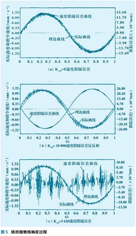 對于沒有前饋的位置伺服系統來說,跟隨誤差總是和速度、加速度成比例。伺服系統引人速度前饋和加速度前饋項后,通過用拋物線響應調節速度前饋和加速度前饋,可減小或消除系統跟隨誤差。通過系統的拋物線響應來進行系統的動態特性研究和評估,通過系統拋物線響應過程中的速度跟隨誤差來判斷系統動態性能的優劣。