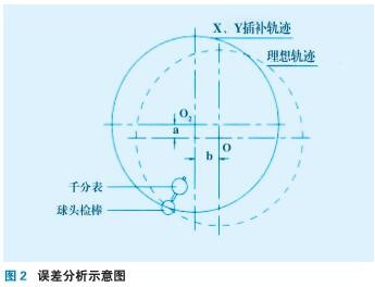 以只考慮直線軸聯動回轉中心與C 軸回轉中心在X、Y 方向上誤差為例。如圖2 所示,數控機床X、Y、C 軸在X/Y 平面內,做大圓聯動,通過千分表的變化來進行誤差分析。如圖3 所示,X、Y 插補軌跡與理想軌跡之間的誤差是由于直線軸聯動回轉中心O2 與C 軸回轉中心O 在X/Y 方向上誤差a/b造成。因此通過對千分表變化值的分析,計算出a/b 值,進入數控系統進行誤差補償,以減小X、Y插補軌跡與理想軌跡之間的誤差。