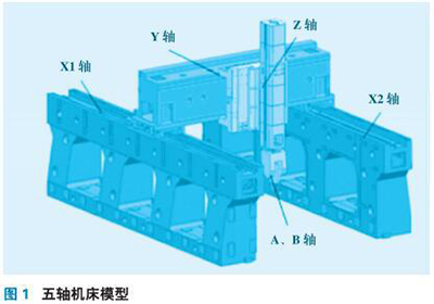 全球化的競爭迫使生產企業越來越重視產品的加工效率和精度,產品精度很大程度上由機床的精度所決定。五軸數控機床能實現對復雜異型曲面零件進行高速、高效、高精度加工,廣泛地運用在汽車、軍工、能源等行業,近年來越來越倍受機械加工行業的重視。五軸數控機床受幾何誤差、熱變形誤差、動態誤差等各種因素的影響,其加工精度往往很難滿足實際生產需求。通過更換高精度傳動部件和伺服控制系統來提高機床精度易受技術和生產成本等瓶頸的限制,因此對機床進行誤差補償已成為提高加工精度的一種有效方法。機床的誤差主要有空間運動學誤差、熱變形誤差、動力學誤差以及運動控制與控制算法誤差等,尤其是機床在加工過程中還存在熱變形誤差和承載變形誤差,并且這類誤差存在非穩定性和時序性,且分布較為復雜,因此,實現高精度誤差補償的關鍵技術是需要精確地建立數控機床綜合誤差的計算模型。目前,數控機床誤差的理論建模技術主要有幾何建模法、齊次誤差矩陣法等幾種。SheChenhua提出了一種通用型五軸機床誤差補償后處理模型,并有效地提高了補償精度。文獻和文獻中采用多體理論對五軸機床的幾何誤差和熱誤差進行了簡化與建模分析。Bohez 等提出了一種分離低階誤差分量的識別方法。盡管上述研究都取得了一定成果,但這些方法都存在著魯棒性差、數學表達式冗余復雜、誤差分量不確定、補償精度差等問題,并沒有從根本上解決機床誤差建模和機床誤差補償的問題。作者以五軸機床CGM4000 為研究對象,基于多體動力學建立了誤差綜合補償模型,尤其針對機床熱誤差,提出了5 點測量法和6 點測量法分別對主軸、進給軸進行熱誤差辨識。針對機床誤差的不穩定性,不完整性等“貧信息”特性,提出了變權系數灰色模型( variable weight GM( 1,n) ,簡稱VW - GM( 1,n) ) 擬合熱誤差值,建立機床熱誤差預測模型。基于上述算法開發了易于數控系統自動解算的誤差補償單元,并通過試切加工驗證了該補償算法的有效性。