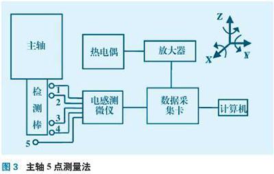 通過第1.3 節分析,基于小誤差假設,機床綜合誤差E0可以看成機床幾何誤差E1和熱誤差E2的線性疊加,即E0= E1+E2。幾何誤差分量可以采用15 線、22 線等方法辨識出,已被廣泛引用,故本節不再說明。本節主要針對熱誤差展開研究,提出了測量主軸熱誤差的5 點測量法和測進給軸熱誤差的6 點測量法。測量系統包括: M10 激光干涉儀、EC10環境補償單元、分光鏡、反射鏡、PC 機、電感測微儀和溫度熱電偶。根據文獻,在機床主軸和X1 軸的熱敏感點處出安裝熱電偶溫度傳感器和電感測微儀進行數據采集。如圖3 所示,測量主軸在x、y、z 方向的熱偏移誤差和繞x、y 方向的熱傾斜誤差,其中1、3 為x 向測量點,2、4 為y 向為測量點,5為z 向為測量點。通過數據采集卡獲取相應的熱變形量σi( t) (i = 1,…,5) ,則: ΔSx( t) = (σ3-σ1) ; ΔSy( t) = (σ4-σ2) ;ΔSz( t) = -σ5; Δεxs( t) = ( σ3-σ1) l /l1; Δεys( t) =( σ4-σ2) l /l2; 其中,l1為1、3 測量點間的距離,l 2為2、4 測量點間的距離,l 為主軸長度。