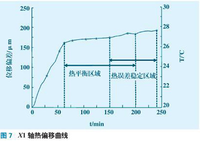 基于上述模型算法,為了驗證該算法的有效性,以CGM4000為實驗對象,該機床X、Y、Z軸行程為:4 000、2 500、600 mm,配置FIDIA 的雙擺頭,A 軸轉動范圍+90°~-110°、B 軸轉動范圍±360°。該型數控機床承重件采用了熱對稱結構設計,進給軸采用一端固定,另一端浮動的結構,有效地減小了由溫升而引起的絲杠翹曲變形誤差,并消除了絲杠反向間隙。進給絲杠選取THK 的空心滾珠絲杠,由于采用中空內冷方式,有效降低了滾珠絲杠的溫升,最大限度的減少了滾珠絲杠副的熱變形誤差,從而保證了機床的高定位精度。數控系統采用SIMEMS840D,該系統具有良好的開放性,可將機床誤差補償算法集成到數控系統中去。考慮機床加工工況因素,反復優化補償參數,通過數控系統內部的PMC 單元開發一種新型的五軸機床綜合誤差補償系統。在機床加工過程中,若干個關鍵點的溫度值和熱誤差值可通過熱電偶溫度傳感器、電感測微儀等儀器來采集,將數據輸入誤差補償模型中進行解算得到補償值,補償值反饋到機床CNC 系統,由CNC 系統驅動各軸電機控制器,完成實時補償。基于上述條件以X1 軸為例進行實時綜合誤差補償驗證,其余進給軸驗證方法相同,鑒于篇幅關系這里不再贅述。為了獲取機床的熱平衡區,以X1 軸為研究對象,機床開啟循環冷卻系統進行試切加工,以加工某型葉輪為例,工件毛坯材料0Cr18Ni9Ti,機床主軸轉速為1200 r /min,進給速200 mm/min。X1軸位移偏差值和機床溫度的關系如圖7 所示,在20 ~26.3 ℃區間內,機床溫度隨時間上升,變化趨勢陡峭,在26.3 ~27.2 ℃區間內,機床溫升曲線隨時間變化趨勢平緩,此溫度區間為機床的熱平衡區域。另外在20 ~26. 8 ℃區間內,X1 軸熱位移偏差隨溫度升高變化明顯,而在26.8 ~27.8 ℃區間X1 軸熱位移偏差量熱位移偏差隨溫度升高變化趨勢平緩,此溫度區間為機床的熱誤差穩定區域,該區間與熱平衡區間部分重合,在這段區間內機床的熱誤差處于一個有規律的穩態。實測X1 軸熱誤差偏移量如圖8 所示。