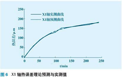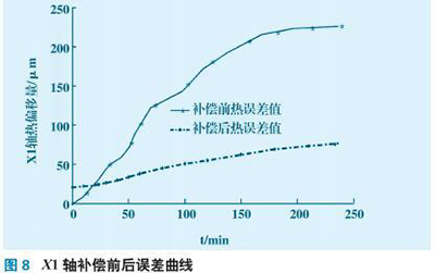 從圖8 中可以看出,X1 各軸的熱誤差偏移量減慢,通過誤差補償算法,完成補償后誤差變化量在0 ~ 29 μm 之內。由此可見機床綜合誤差補償系統是非常有效的,機床的精度有了顯著的提高。另外,若因冷卻系統發生故障,則會導致機床由于溫升過高,數控系統報警而無法工作,此刻機床熱誤差處于無序狀態,不在本文討論范圍之內。